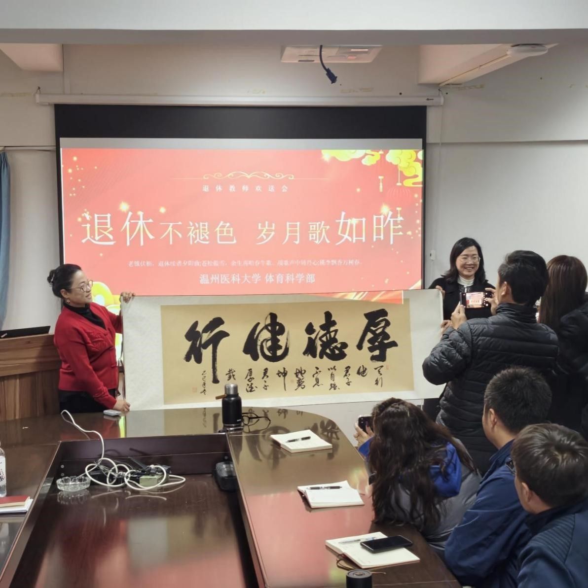 刘海平主任代表皇冠体育官网 向滕青老师郑重颁发退休纪念品,这份承载着岁月荣光的礼物,寄托着皇冠体育官网 对耕耘者的崇高敬意与美好祝福。滕青老师双手接过,她动情表示:“虽已离开讲台,但心永远与皇冠体育官网 同在,愿皇冠体育官网 蒸蒸日上,愿后辈们续写华章!”随后,滕青老师回赠皇冠体育官网 一份寓意深远的礼物——她撰写的大幅书法作品“厚德健行”,陈素云书记代表皇冠体育官网 接过礼物。以物寄情,表达对皇冠体育官网 未来蓬勃发展的殷切期许,和对全体教师的勉励。这份双向的馈赠,让“传承”二字有了最温暖的注解。